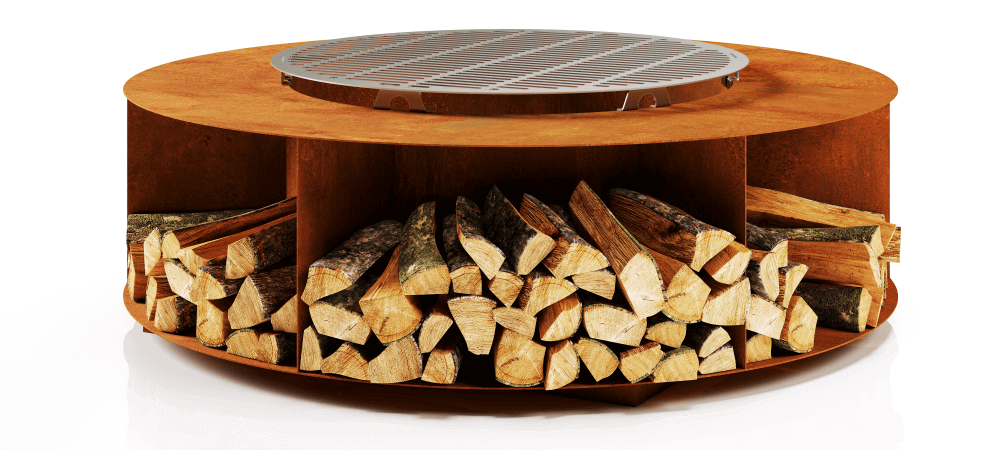 The Vincent is a minimalist-style outdoor fireplace that perfectly complements any outdoor space, making it a stylish and eye-catching element that enhances a cozy atmosphere. The built-in wood storage around the fire pit ensures that firewood is always within reach.