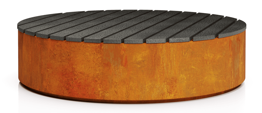 Dimensions: diameter 1800 mm, height 450 mm, seat width 180 mm, steel thickness 3 mm. The seat is made from durable burnt wood (available in a wide range of colors).