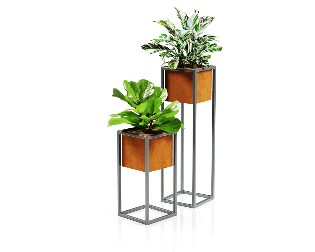 A wonderfully elegant combination – a rusted steel pot and a gray stand.
