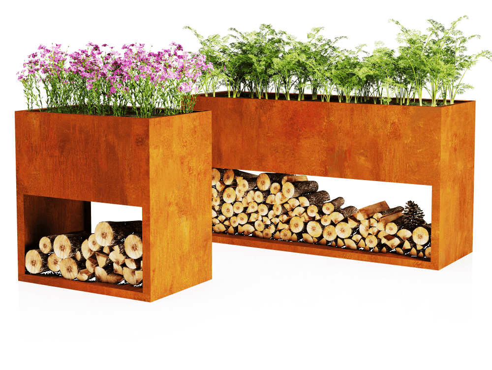 Rectangular planters with a firewood holder are a practical and visually appealing solution.
