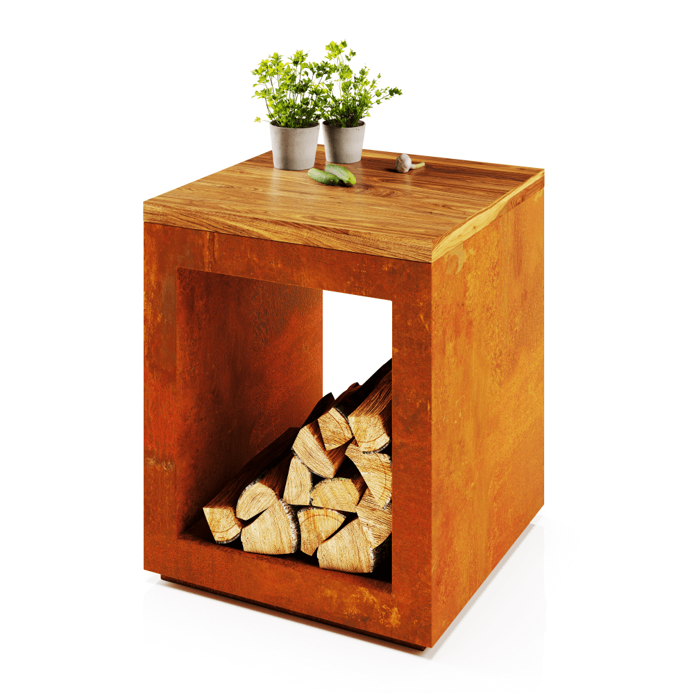 A firewood rack is not only a functional storage solution but also a stylish addition to your yard or home, keeping firewood neatly arranged and within easy reach. These firewood racks can also double as outdoor tables with an integrated wooden tabletop, making them especially well-suited for pairing with the “Leo” patio fireplaces and grills (see photo).
