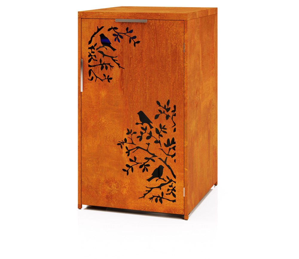 Modern and practical Corten steel waste container shelter – “Amelia”. The ideal solution for those who want to create a uniform and stylish waste sorting point, and ensure that outdoor spaces look neat and beautiful. The stylish and beautiful laser-cut pattern ensures air circulation and prevents the accumulation of bad odors.