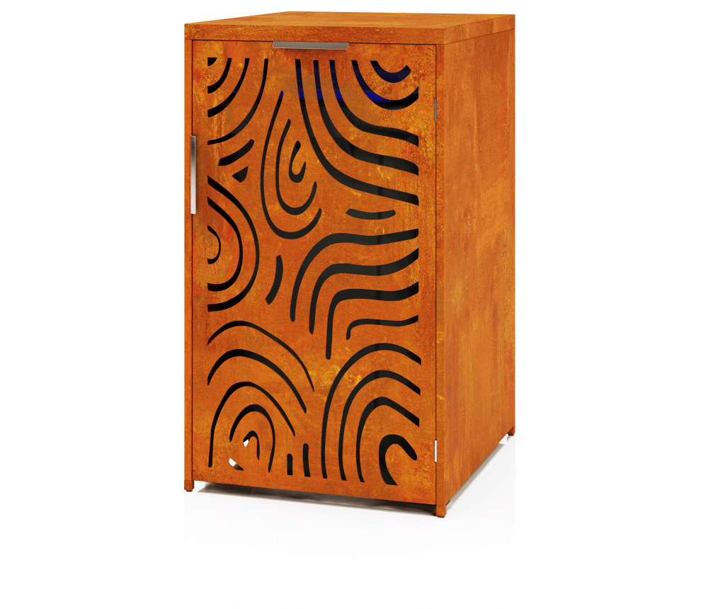 Modern and practical Corten steel waste container shelter – “Olivia”. The ideal solution for those who want to create a uniform and stylish waste sorting point while ensuring that outdoor spaces look neat and beautiful. The stylish and elegant laser-cut pattern ensures air circulation and prevents the accumulation of bad odors.