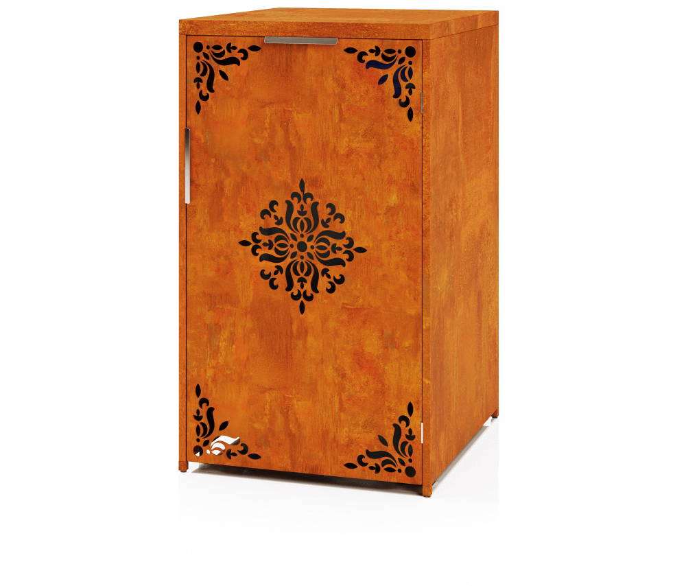 Modern and practical Corten steel waste container shelter – “Sandy”. The ideal solution for those who want to create a uniform and stylish waste sorting point while ensuring that outdoor spaces look neat and beautiful. The stylish and elegant laser-cut pattern ensures air circulation and prevents the accumulation of bad odors.