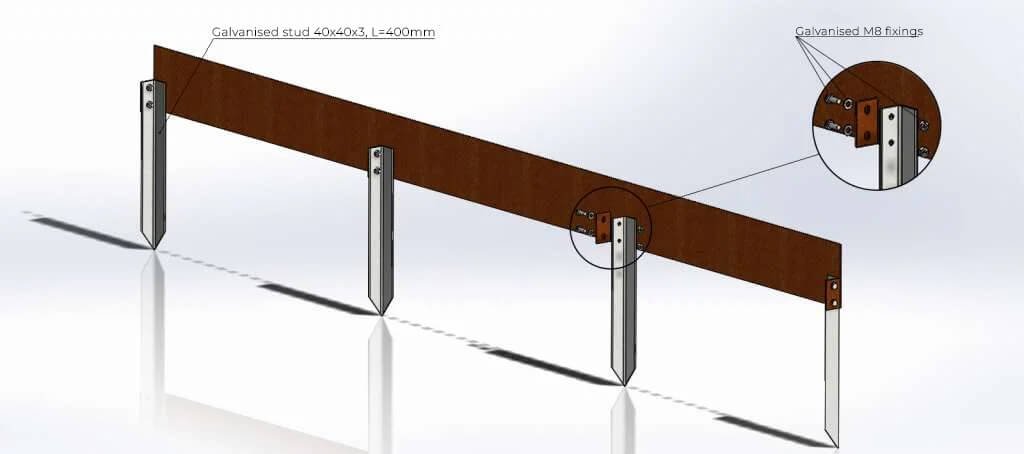 The fastening system developed for these edgings ensures extreme strength and quick installation. 400 mm galvanized stakes are manually driven into the ground and securely fastened to the edging with screws.